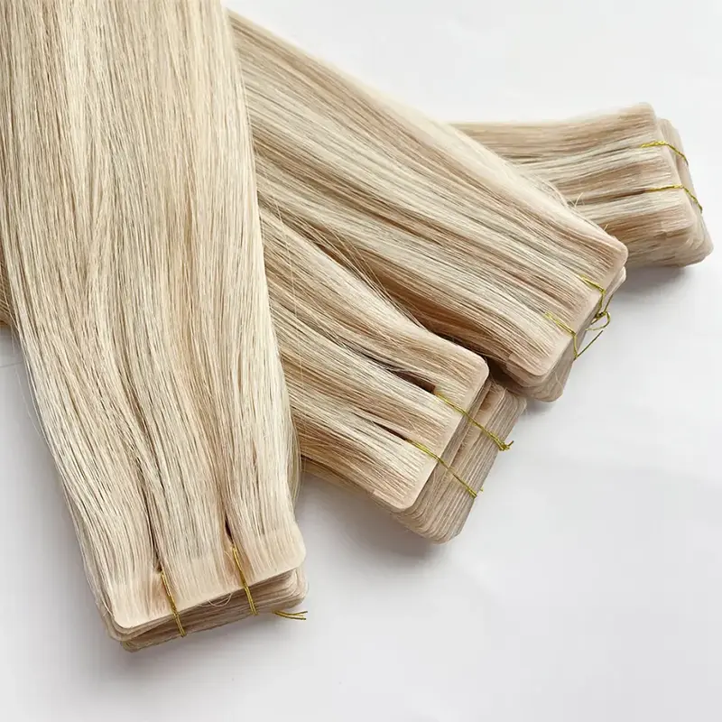 Remy Invisible Tape-in-Extensions können sowohl aus Cuticle-Remy-Echthaar als auch aus Standard-Remy-Haar hergestellt werden. Cuticle-Remy-Tape-in-Extensions sind gesund, glatt, frei von Verfilzungen und immer nicht flauschig, sodass sie auch nach mehrmaligem Waschen ihre ursprüngliche Form behalten. Zögern Sie nicht, Haarverlängerungen bei Lum Hair für Ihren Großhandel vor Ort zu bestellen. Als bester Hersteller von Haarverlängerungen im Großhandel verwendet Lum Hair wasserdichtes, superstarkes Walker-Klebeband für eine gute Haftung. Die Bandgröße kann 4 x 0,8 cm, 2 x 0,8 cm, 4 x 0,4 cm, 3 x 0,7 cm usw. sein. Es kann einfach installiert, entfernt und erneut angebracht werden. Wir empfehlen, das Klebeband alle 4 bis 8 Wochen durch ein neues zu ersetzen.